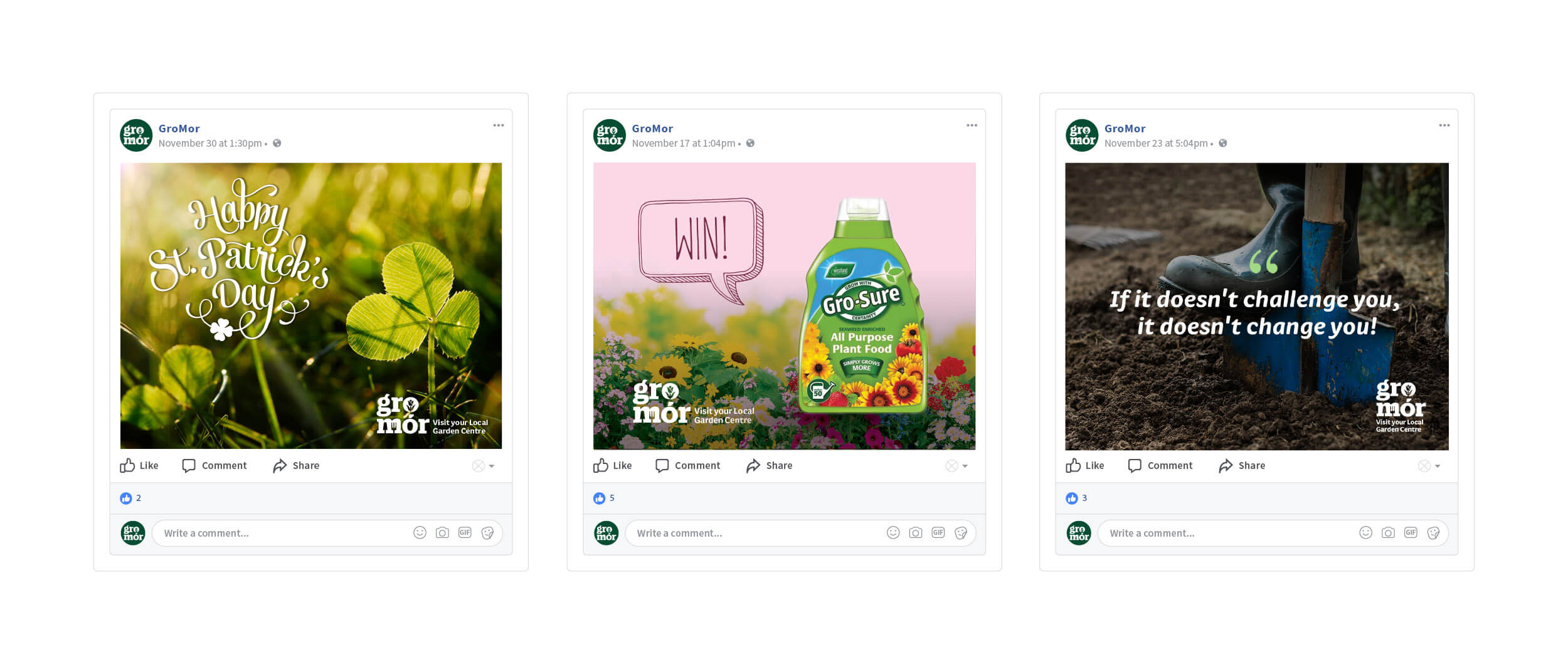 The website and point of sale materials helped build the brand and get awareness into households across Ireland. The 2016/2017 campaign was a huge success! GroMór has seen a 35% growth in the fan base as well as an increase of 33% in web users compared with the same period last year. Utilising social content, blogs, events, studio artwork, competitions and POS material, 164% more people have clicked to find their local GroMór centre in the past 6 months than the same period last year!