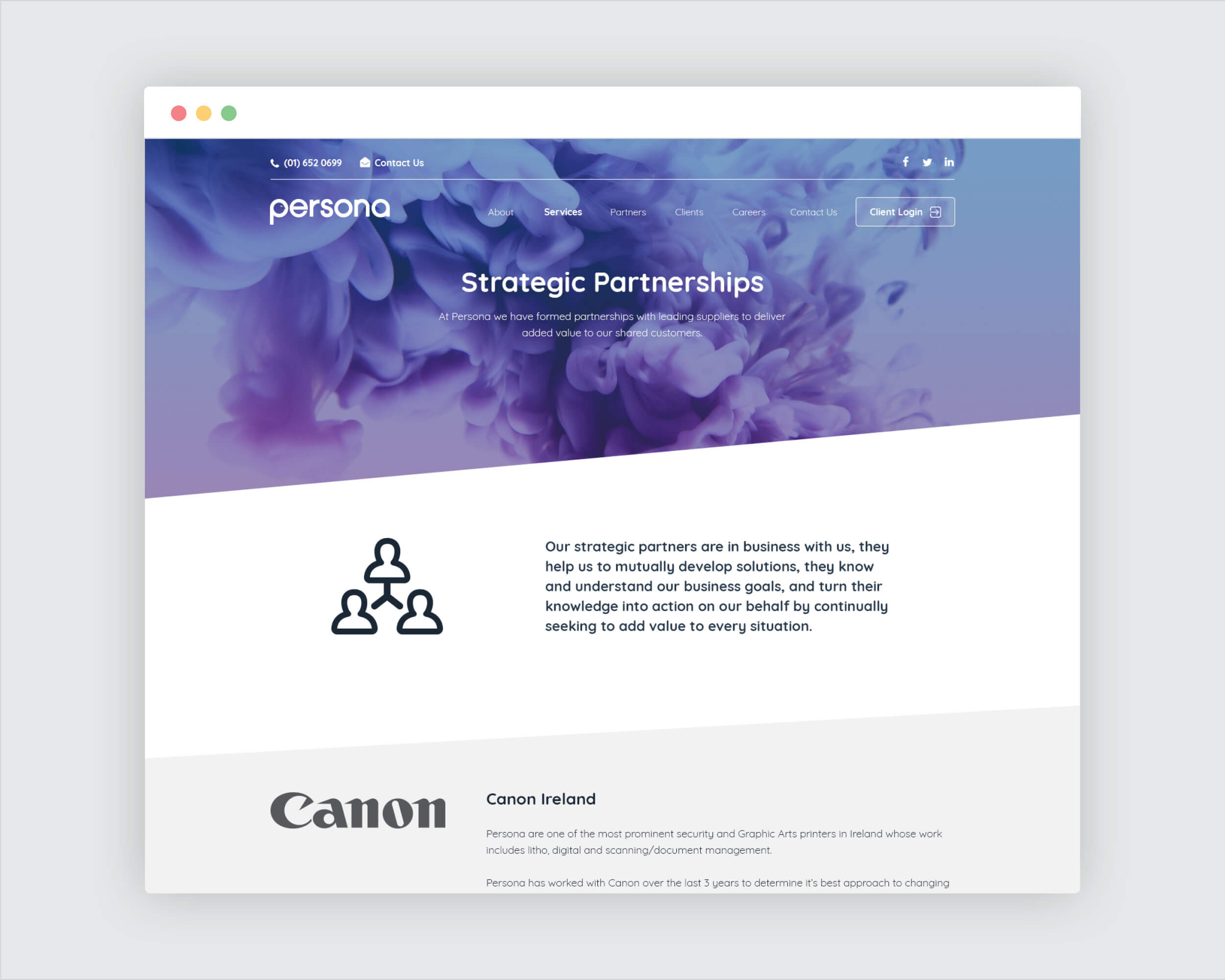 Idea’s presented a reliable, innovative and security-focused website and brand showcasing Persona’s new era for business. We emphasised their wide partnership base, clients, services and story. Persona’s unique approach and accreditations were also showcased effectively, and a client login section enables easy access and increases sales and brand loyalty. A clear contact us call to action encourages lead generation, while the partners and clients section highlights their expertise, proficiency and industry trust. Soft primary and secondary colours showcase Persona as a trusted, established brand – while emphasising their industry expertise.
