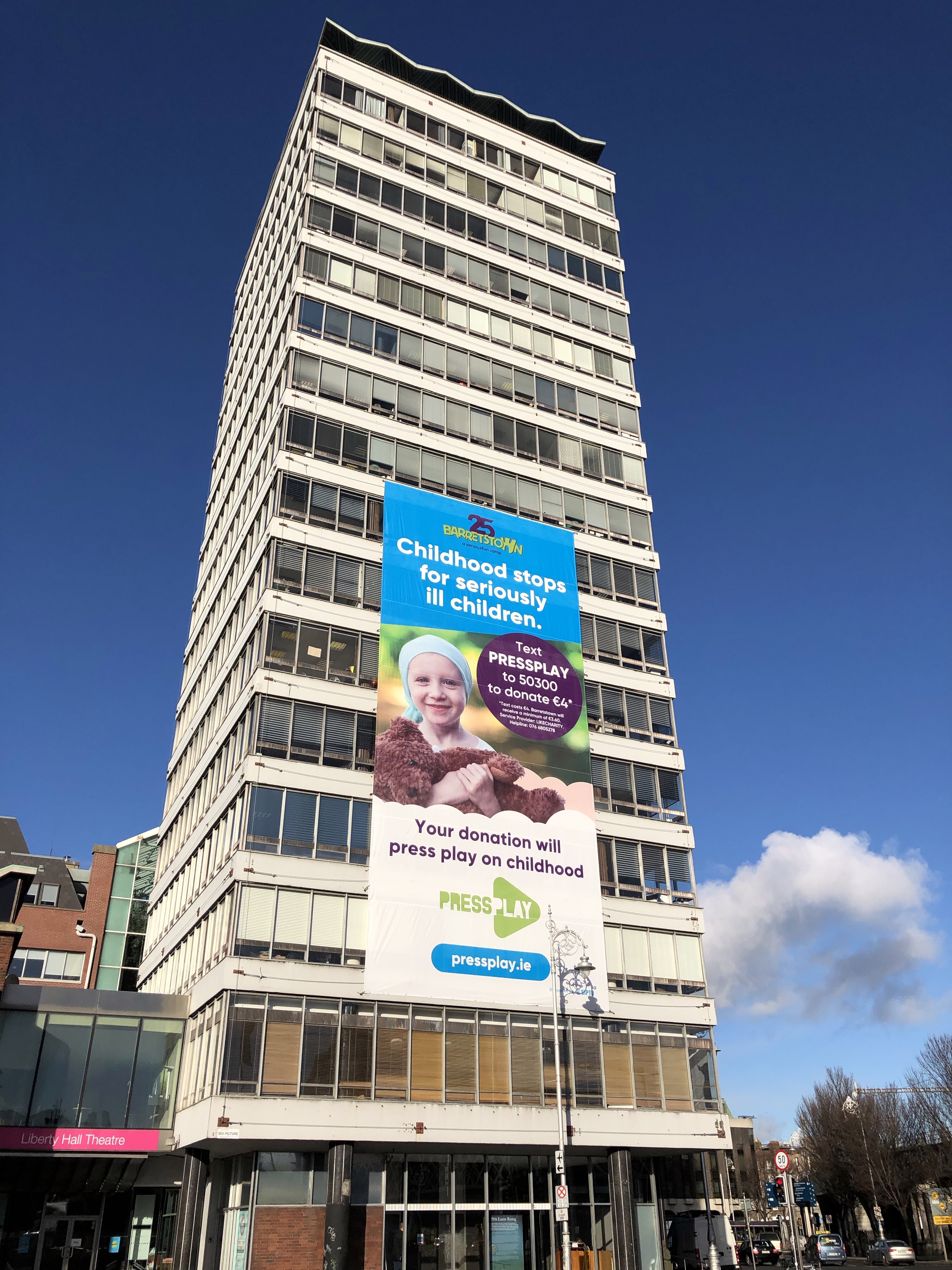 Idea were thrilled and honoured to work with Barretstown on ‘Press Play’. Our team developed the ‘Press Play’ concept and designed and delivered all the elements required for the Teaser and Reveal campaigns, including outdoor media, website, video, TV ad and launch items. We took the campaign to new heights – with the ‘Press Play’ poster being displayed on Liberty Hall on Dublin’s Quays.