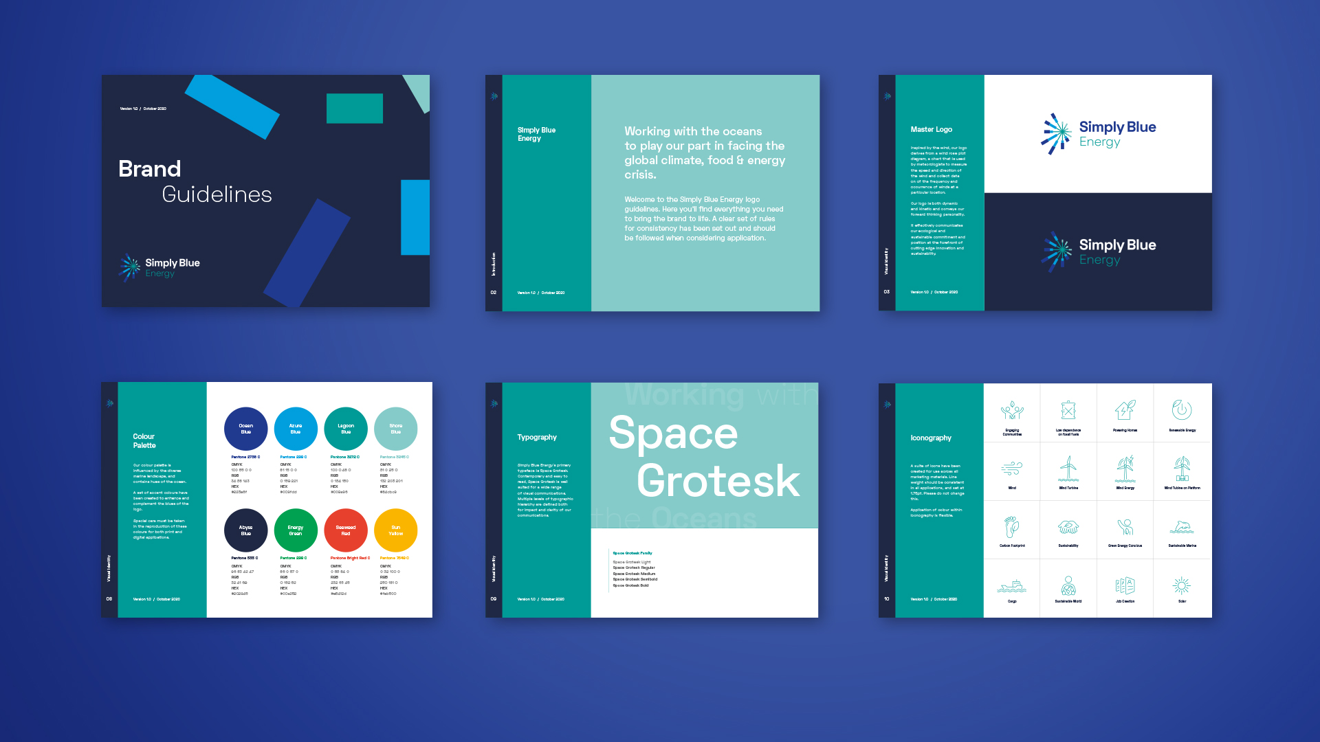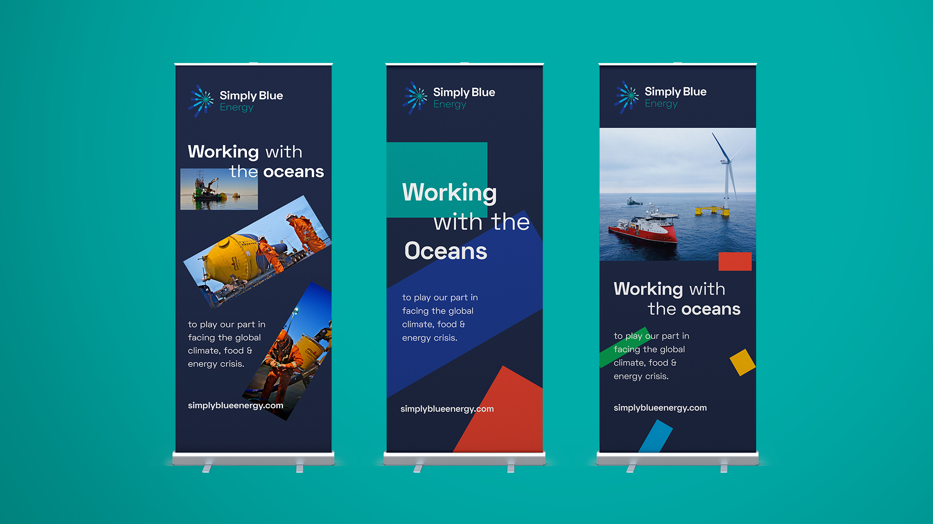 A personable and humanistic feel is emphasised by the sans serif typeface, whilst the colour scheme brings to mind the diversity of the ocean and marine landscape. The addition of the tagline “Working with the Oceans” effectively communicates Simply Blue Energy’s ecological and sustainable commitment.