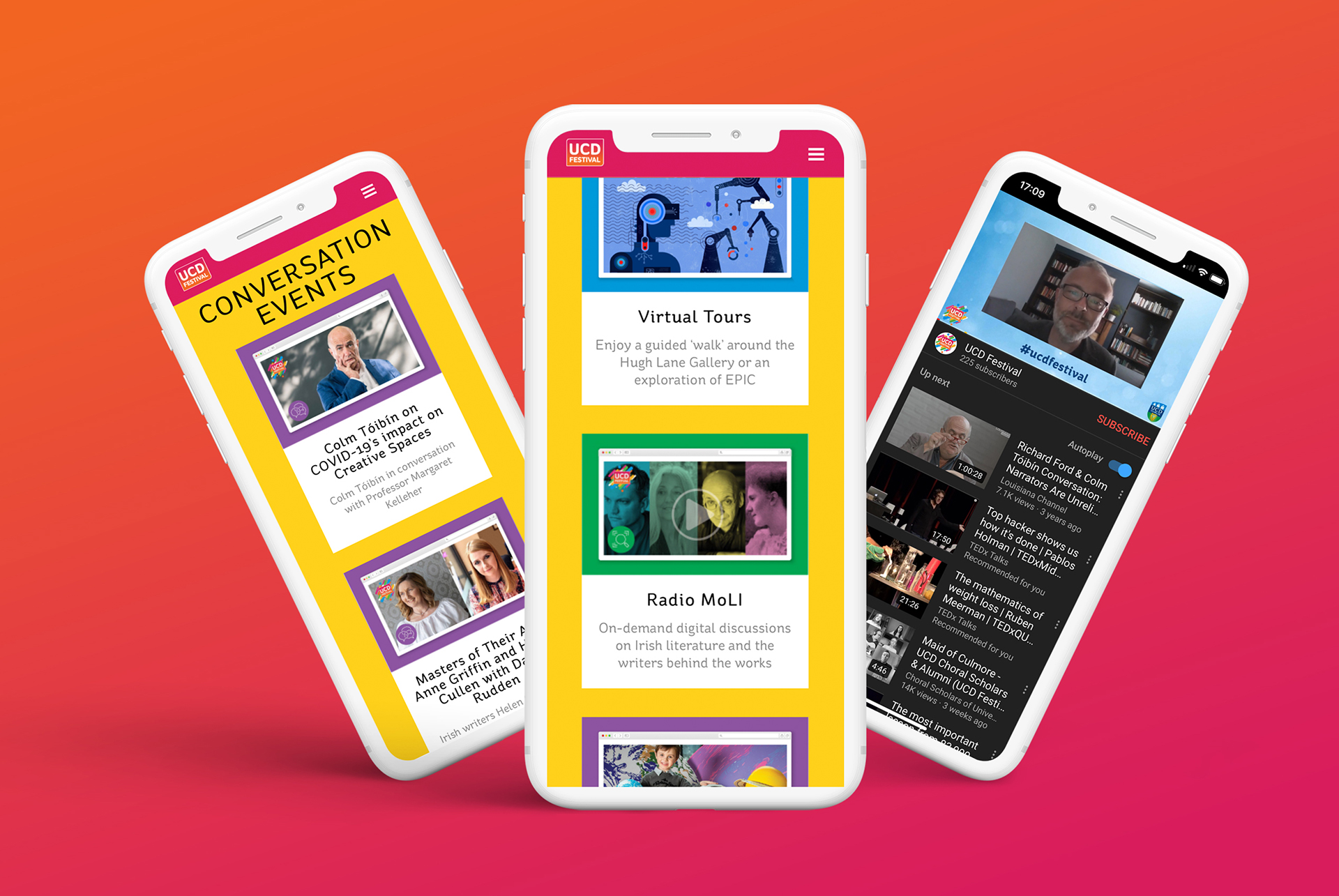 Working closely with the UCD team, Idea designed and developed a landing page initially to communicate the change of plan for this year’s festival and to capture interest. This was quickly followed up with the full festival website that served as the launch platform for all the virtual events on offer.