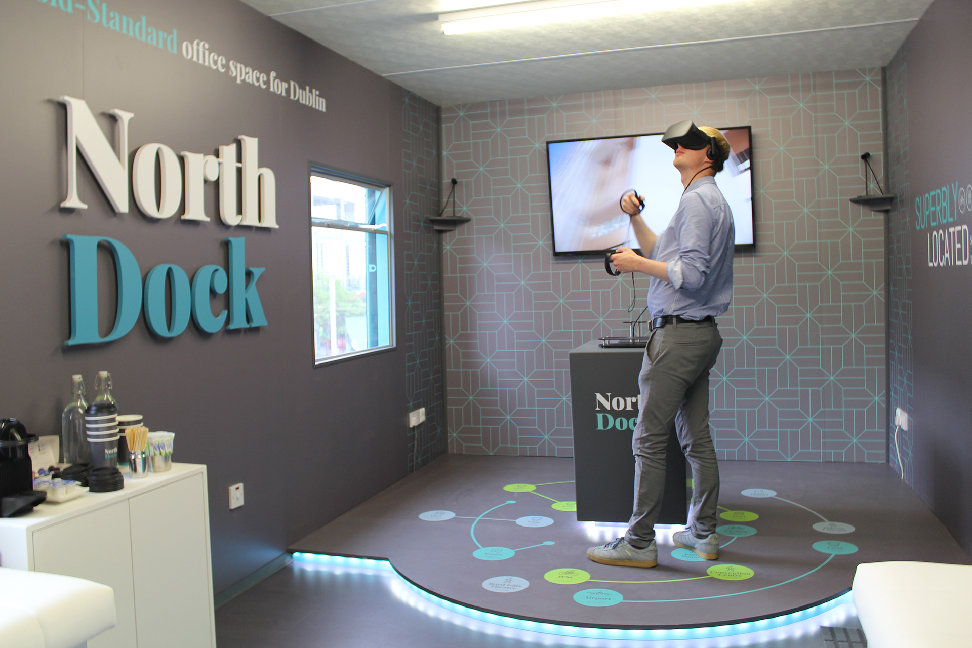 We have brought the future development for North Dock to life by using 360 Virtual Reality (VR) content within this Marketing Suite. Due for completion in two years time, this virtual tour allows agents and customers to explore and view the vision of North Dock. The audience gets to experience the outside views of approaching North Dock, walking into the reception area and exploring a typical floor of the building, furnished and unfurnished. This very immersive technology creates a unique and dynamic experience that helps to experience and sell this future development, allowing the audience to appreciate the layout, sense of space and all the potential a building of this scale can have for their business. For anyone not wishing to use the VR headset, the virtual North Dock development can also be viewed on the wall mounted TV within the marketing suite.